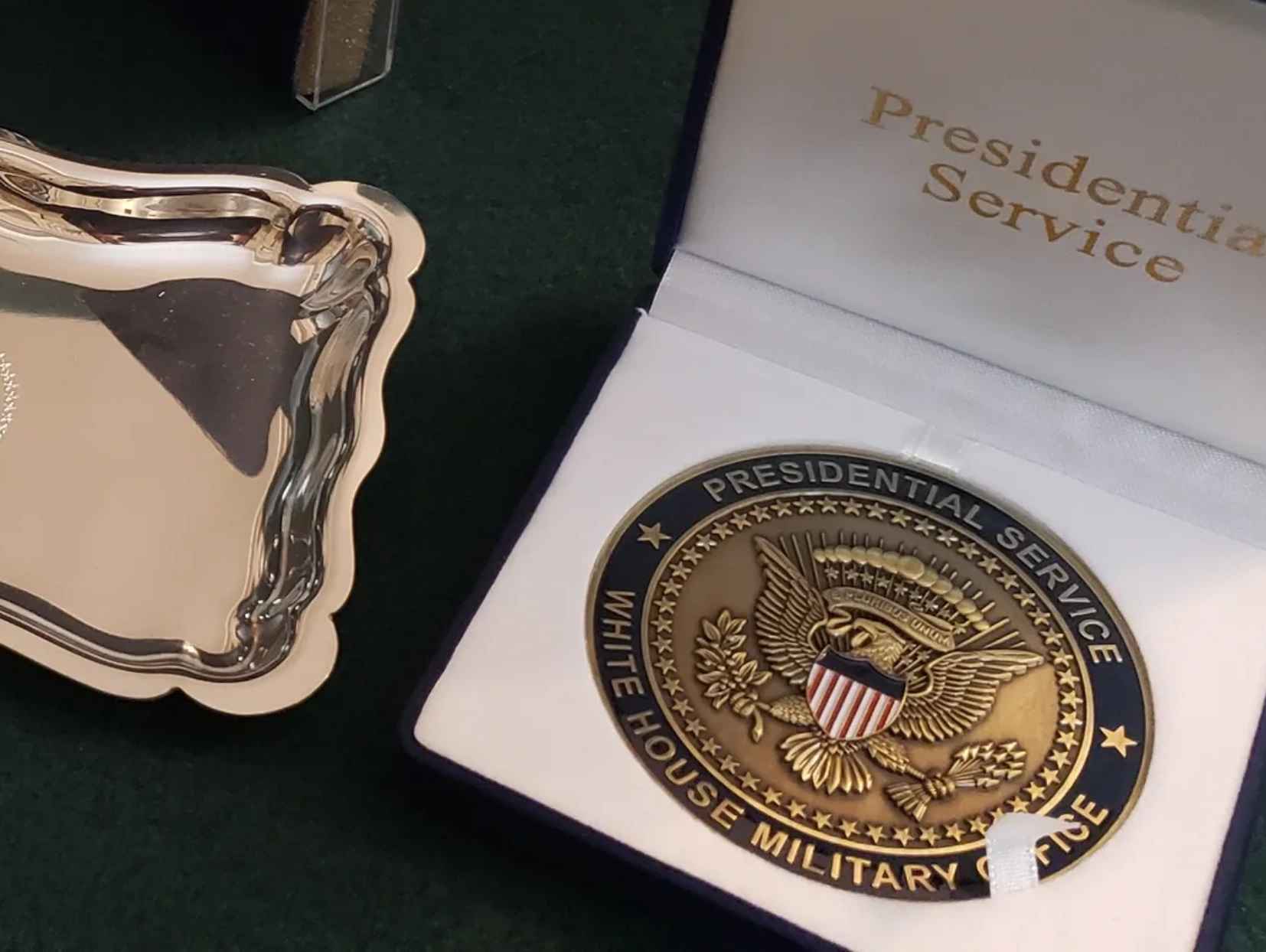 US Presidential Service Center gold coin with white silk and gold foil lettering in a blue felt box.